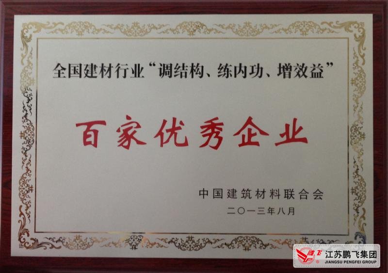 為樹立典型,有效遏制經(jīng)濟效益下滑,推進建材行業(yè)調(diào)整結(jié)構(gòu)和轉(zhuǎn)型升級,弘揚正能量,發(fā)揮優(yōu)秀企業(yè)的典型示范作用,促進行業(yè)科學(xué)發(fā)展,中國建材聯(lián)合會與各省市地方建材行業(yè)協(xié)會聯(lián)手開展推薦表彰“調(diào)結(jié)構(gòu)、練內(nèi)功、增效益”百家優(yōu)秀企業(yè)評比表彰活動。江蘇鵬飛集團強抓市場機遇,堅持科學(xué)發(fā)展之路,創(chuàng)新經(jīng)營模式,被授予“調(diào)結(jié)構(gòu)、練內(nèi)功、增效益”百家優(yōu)秀企業(yè)榮譽稱號。