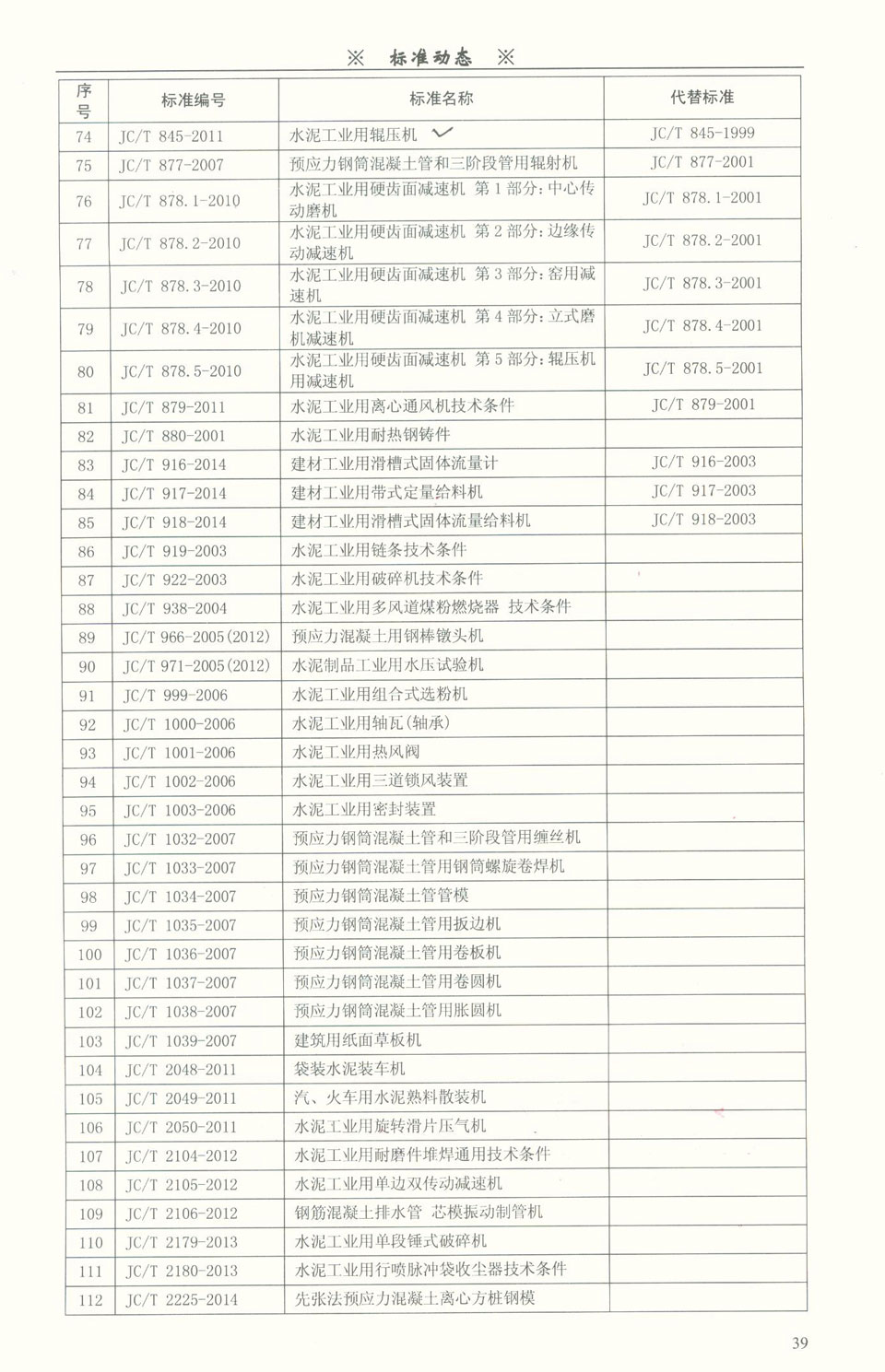 江蘇鵬飛集團著眼于國內建材機械新技術、新產品、新工藝、新材料的技術領域,普及和提高標準化意識,強化新標準的宣貫工作,提高對標準化工作的感知、重視程度,全面提高行業各類標準的覆蓋率,創造更加良好的標準化工作發展空間。公司在企業內部制定并實施了技術標準、管理標準和工作標準并有效組織推進實施,先后參與國家建材機械標準化技術委員會組織的GB/T27976-2011水泥工業管磨裝備、JC/T 333-2006 水泥工業用回轉窯、JC/T 334.1-2006水泥工業用管磨機、JC/T335-2006 水泥工業用回轉烘干機、JC/T 336-2014 水泥工業用推動篦式冷卻機、JC/T 402-2006 水泥機械涂漆防銹技術條件、JC/T 825.1-2001(2009) 水泥工業用自動控制預加水成球裝備 雙管螺旋喂料機、 JC/T 833-2011 水泥工業用堆取料機 技術條件 JC/T 842-1999 水泥工業用單筒冷卻機、JC/T 844-2007 水泥工業用立式輥磨機、JC/T845-2011水泥工業用輥壓機、JC/T401-2011建材機械用鑄鋼件技術條件、JC/T999-2006水泥工業用組合式選粉機、JC/T406-2006水泥機械包裝技術條件、JC/T405-2006水泥工業用增濕塔等15項產品標準起草工作.