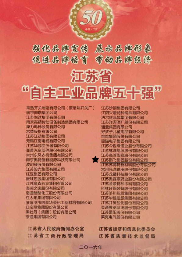 鵬飛集團入選2015年度“江蘇自主工業品牌50強”企業