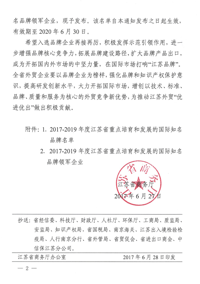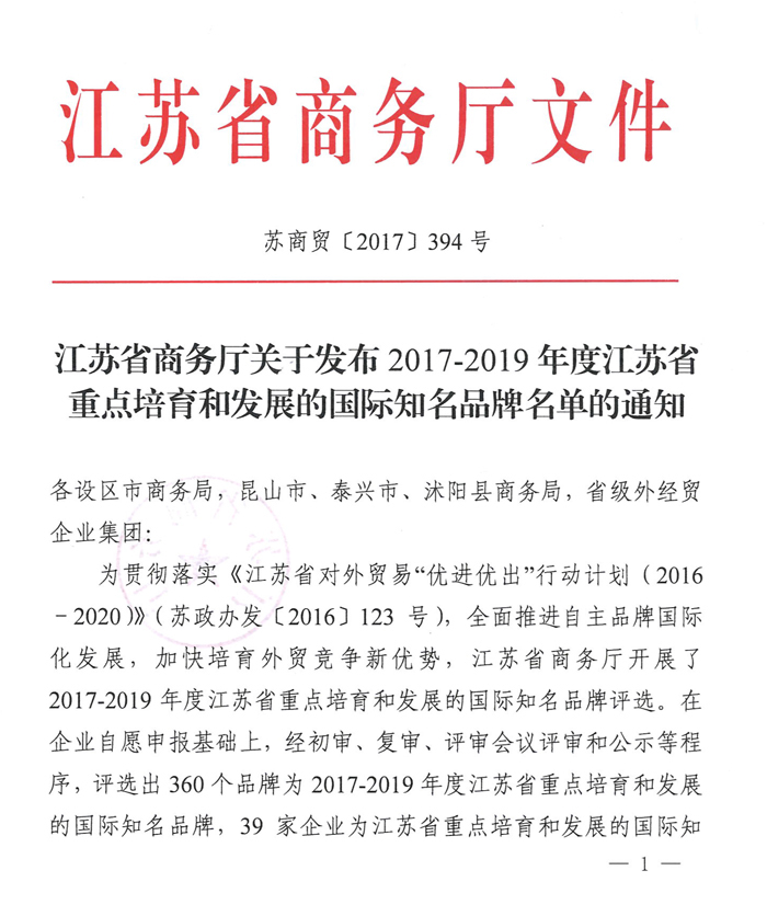 近日,省商務廳公布“2017-2019年度江蘇省重點培育和發展的國際知名品牌”名單,經過層層評比,江蘇鵬飛集團榮膺在列。