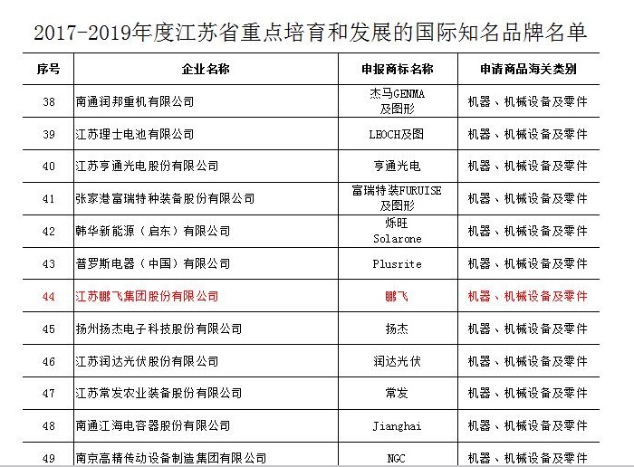 “鵬飛”入選江蘇省重點培育國際知名品牌名單