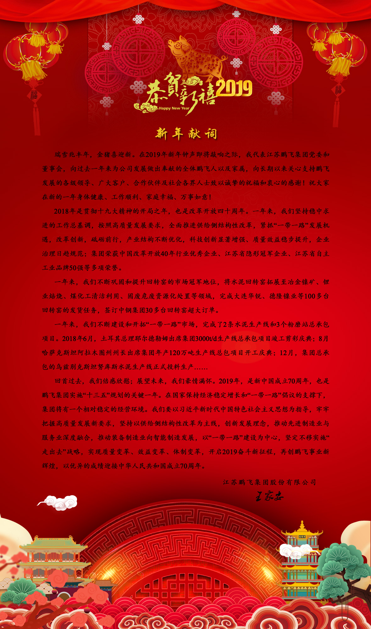 瑞雪兆豐年,金豬喜迎新。在2019年新年鐘聲即將敲響之際,我代表江蘇鵬飛集團黨委和董事會,向過去一年來為公司發(fā)展做出奉獻的全體鵬飛人以及家屬,向長期以來關(guān)心支持鵬飛發(fā)展的各級領(lǐng)導(dǎo)、廣大客戶、合作伙伴及社會各界人士致以誠摯的祝福和衷心的感謝!祝大家在新的一年身體健康、工作順利、家庭幸福、萬事如意!