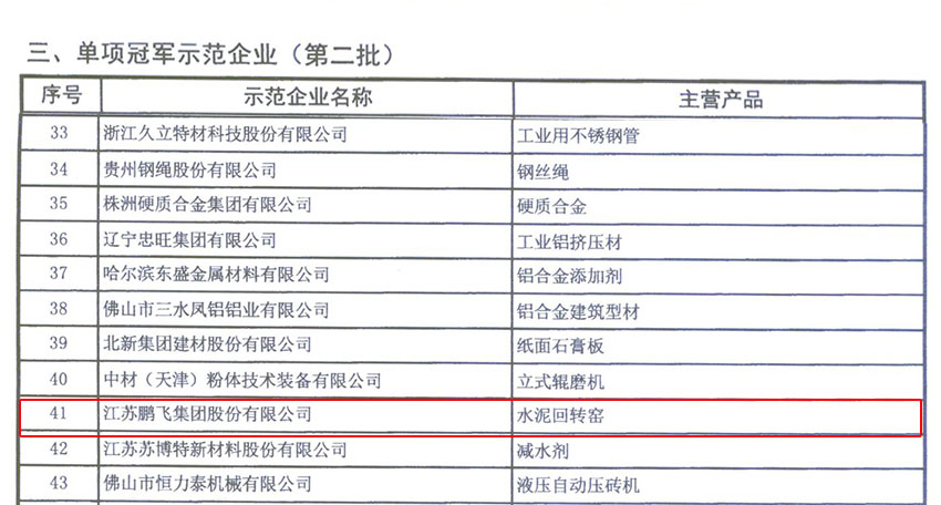 江蘇鵬飛集團股份有限公司榮獲國家制造業(yè)單項冠軍示范企業(yè)稱號,憑借的是主營產品水泥回轉窯的雄厚制造實力。
