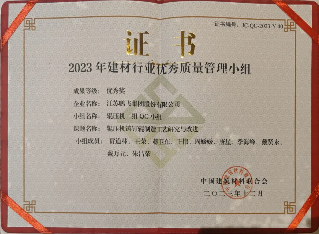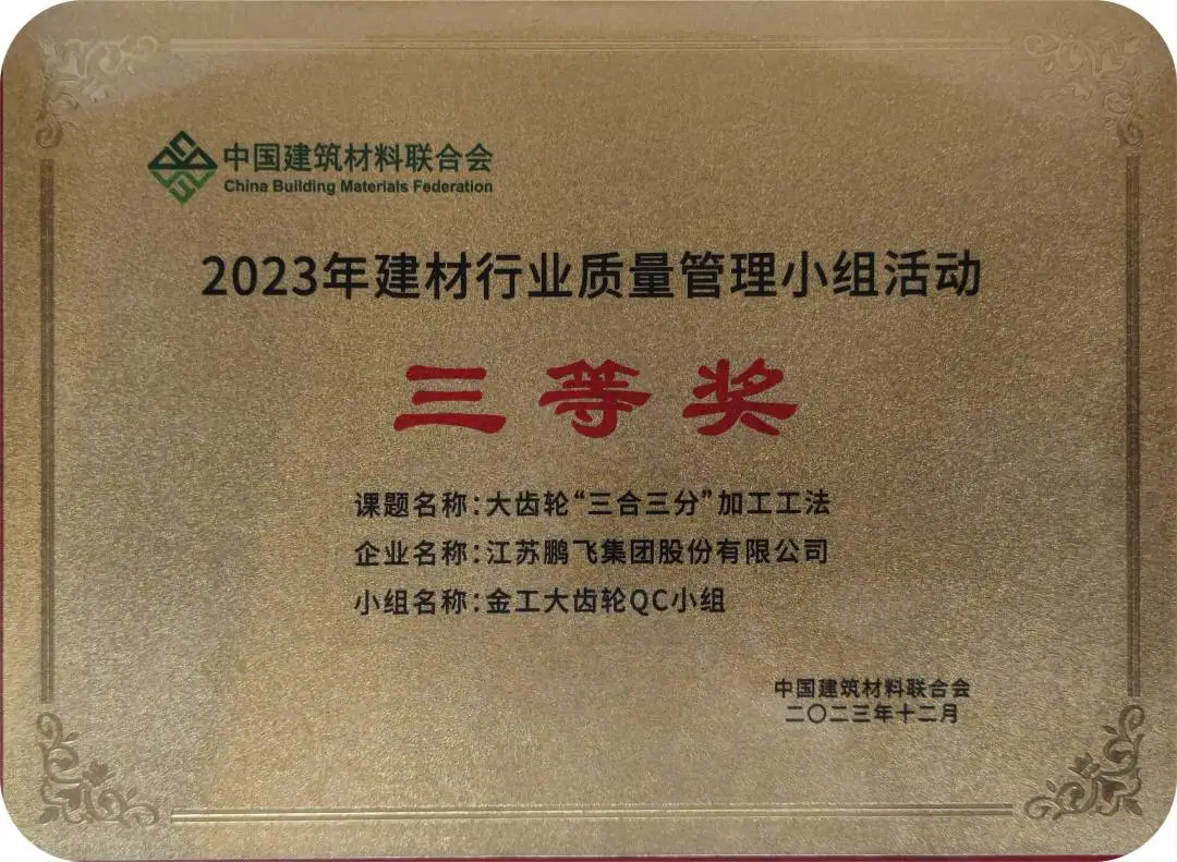 近期,中國建筑材料聯(lián)合會組織召開第三十九次建材行業(yè)質(zhì)量管理小組代表大會暨質(zhì)量信得過班組經(jīng)驗交流大會,會上頒發(fā)了2023年建材行業(yè)優(yōu)秀質(zhì)量管理小組和質(zhì)量信得過班組、先進個人和優(yōu)秀組織榮譽證書。鵬飛金工大齒輪“三合三分”加工工法獲得“2023年建材行業(yè)優(yōu)秀質(zhì)量管理小組三等獎”;輥壓機二組QC小組的輥壓機鑄釘輥制造工藝研究與改進獲得“2023年建材行業(yè)優(yōu)秀質(zhì)量管理小組優(yōu)秀獎”,同時QC小組獲評“我最喜愛的質(zhì)量管理小組”。
