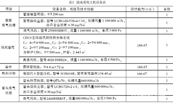 根據該項目的建設規模和地處高海拔地區這一特殊情況,熟料燒成系統設計采用了一套改進型雙列五級CDC二代預熱預分解系統、Φ4.8 m×72 m回轉窯和第四代S型篦式冷卻機等設備組成的窯外分解煅燒系統,日產熟料4 000 t,熟料燒成熱耗3 554.36 kJ/kg(850 kcal/kg)。本配置在平原地區其熟料生產能力可達到5 500 t/d左右。系統主要設備配置見表1。