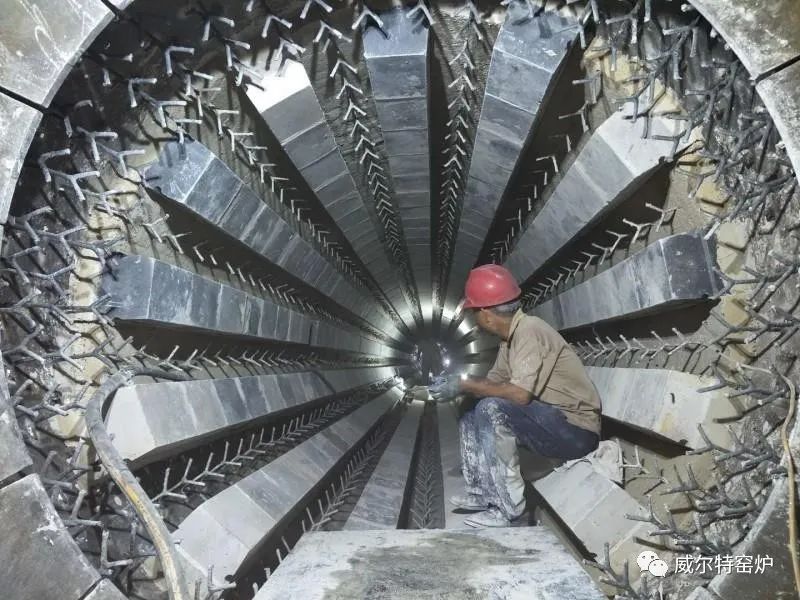窯體砌筑根據耐材結構形式及耐材運輸條件,計劃施工順序如下:從窯頭向窯尾砌筑,鎂鋁尖晶石-高鋁磚-預制塊焊接-粘土磚-窯兩頭澆注料。窯體砌筑前必須試車完畢,運轉正常并有制動裝置,以防窯體因耐火材料的偏重而發生回轉;砌筑需轉窯時以最慢的速度運轉,砌筑完畢后窯體不準隨意轉動。