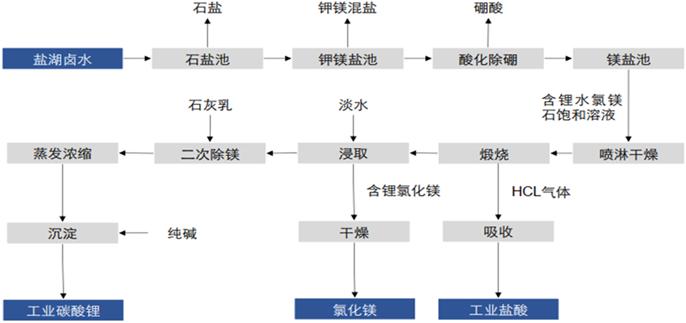(五)煅燒法 煅燒浸取法的部分主要流程與大部分礦石的冶煉方法類似,先將鹵水脫硼,蒸發(fā)濃縮得到水氯鎂石和氯化鋰的固體混合物,再進(jìn)行高溫煅燒(450-900℃)、水浸分離氧化鎂、純堿沉淀分離獲得碳酸鋰。
