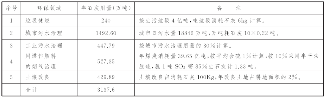 表5 部分環保領域石灰消耗量估算