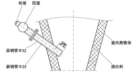 拆下四通及法蘭,在Φ32鋼管內部套裝Φ25鋼管,Φ25鋼管上端與法蘭焊接,下端與原Φ32筒平齊(見圖5)。這樣處理后,預熱器C5B旋風筒負壓正常。
