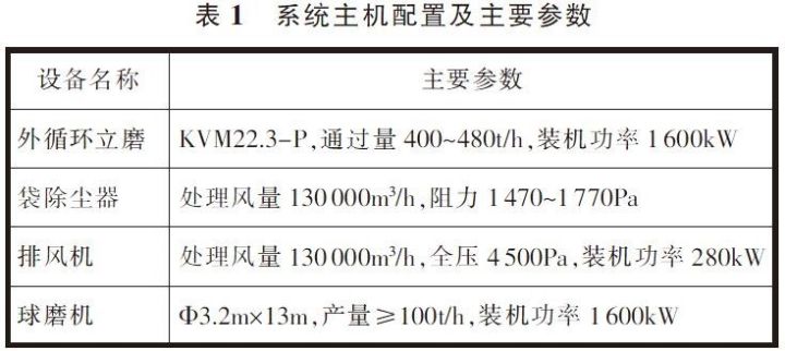 改造后的系統主機配置及主要參數見表1,系統工藝流程見圖1。該系統與其他立磨組成的聯合粉磨系統相比,主要在于立磨本身的高效粉磨特殊設計,另外,選粉系統采取高料氣比設計與操作(實際操作中V型選粉機的料氣比達5.5m3/h),實現選粉系統的最大節能化,并控制合理的入球磨機物料粒度(確保最大顆粒小于1mm),并根據入磨物料的粒度分布對球磨機進行技術改造,達到系統提產降耗的目的。