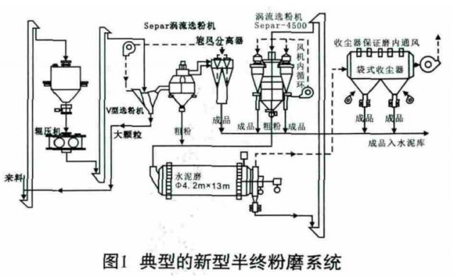 (4)隨著水泥粉磨工藝研究的不斷進步,對傳統(tǒng)聯(lián)合粉磨系統(tǒng)的不斷優(yōu)化,“大輥壓機配小球磨機”的半終粉磨系統(tǒng)脫穎而出。與傳統(tǒng)聯(lián)合粉磨工藝系統(tǒng)相比,輥壓機半終粉磨工藝采用一臺物料處理能力較大的輥壓機和一臺喂料、分選能力大的下進風雙分離高效選粉機,將V選后的細粉再次進行分選,合格細粉從入磨前的物料中被分選出來并直接送入成品庫,中粗粉進入球磨機進行粉磨,大幅度提高了成品產(chǎn)量,改善了球磨機的工況,減少了過粉磨現(xiàn)象的發(fā)生。同時V型選粉機與雙分離高效選粉機共用一臺系統(tǒng)風機,取消了聯(lián)合粉磨系統(tǒng)中一臺循環(huán)風機與旋風收塵器及部分管道和輸送設(shè)備,進而提高了球磨機的綜合臺時產(chǎn)量,降低了粉磨電耗,減少了設(shè)備數(shù)量和維修成本。典型的新型半終粉磨系統(tǒng)如圖1所示。